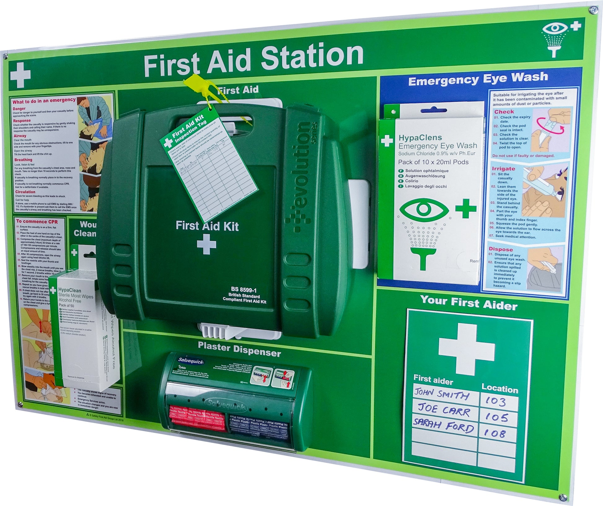 The all-in-one wall-mounted First Aid Station, equipped with a British Standard First Aid Kit in an evolution case, features dispensers for moist wipes, eye wash pods, and salvequick fabric and washproof plasters, along with a tamper-proof stud to indicate when the First Aid Kit has been used, and it also includes Primary survey, CPR, and eyewash guidance with colour illustrations. Dimensions are 59.5 x 84cm