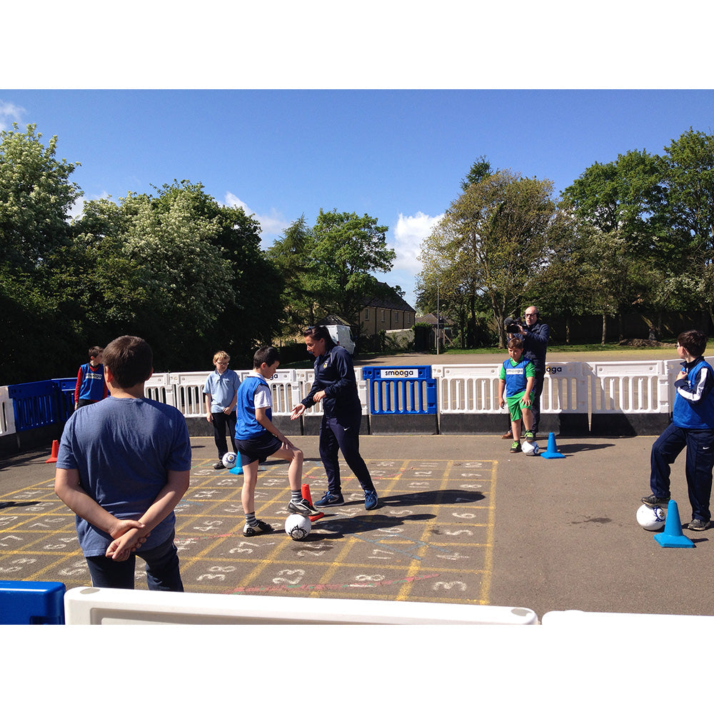 Ideal for smaller playgrounds, the Oxford smooga measures 12m x 8m (or preferred ratio) and is supplied with two 1.5m x 1.2m Mini Target Goals from Harrod's, for the instant containment of running children and loose balls. Whats included: 46 bases, 46 panels & 2 goals (Heavy, stable black recycled plastic base. UV resistant blow moulded HDPE panels. 100% recyclable. Wind tested to 32mph. Max sideways force 400 Newtons. Easy assembly/disassembly)